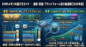DDR5メモリの選び方についてはDDR5メモリの選び方ガイドで詳しく解説しているが、CPU選びとの関連で重要なポイントを2つ挙げる。